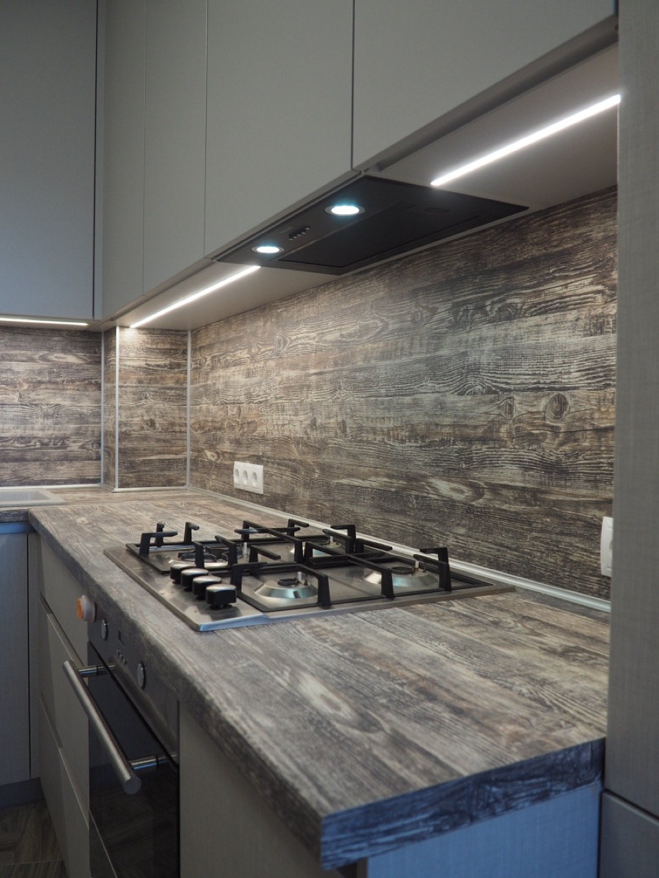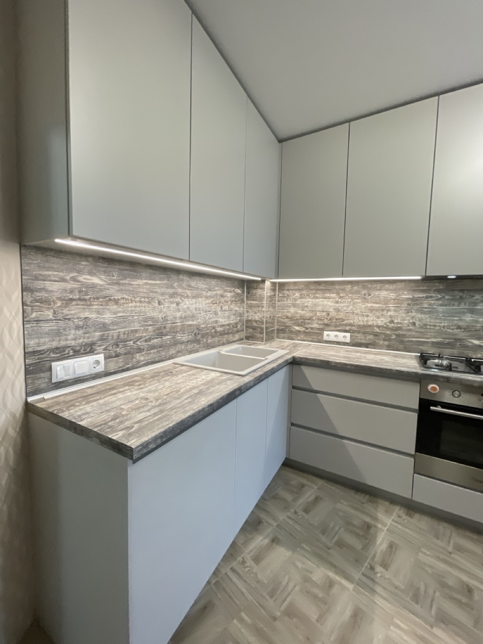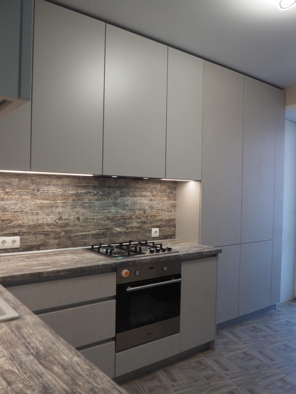 Фасады из ЛДСП Эггер серого цвета дополняют дизайн гарнитура и придают ему современный и минималистичный вид. Этот цвет универсален и легко впишется в любой интерьер. Столешница из пластика практична в использовании и легко поддается чистке, а также имеет высокую устойчивость к царапинам и повреждениям.
