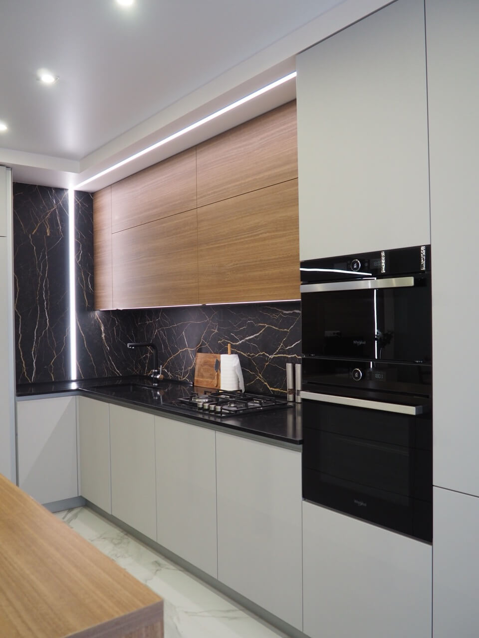Столешница кухни выполнена из натурального кварца, который не только добавляет роскоши и стиля, но и обеспечивает практичность и легкость в уходе. Кварцевая столешница отлично сочетается с серым цветом корпусов, создавая гармоничный и сбалансированный дизайн.