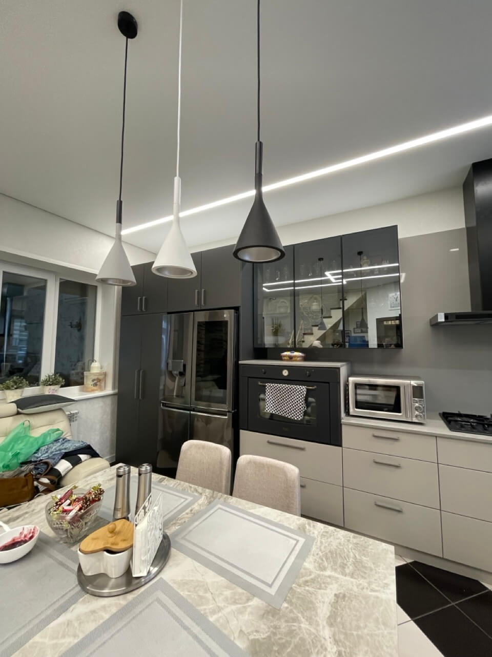 Этот изысканный кухонный гарнитур сочетает в себе стиль и функциональность. Корпус изготовлен из ЛДСП Эггер в цветовой гамме Оникс+Кашемир, что придает кухне современный и утонченный вид. Фасады выполнены из МДФ с пластиковым покрытием Rehau, обеспечивающим высокую стойкость к износу и легкость в уходе.