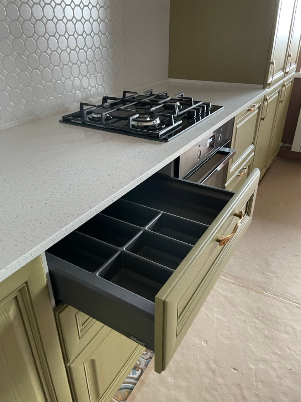 Столешница изготовлена из натурального кварца, который отличается прочностью, стойкостью к царапинам и высокой температуре. Этот материал также имеет гладкую поверхность, которая легко очищается от грязи и пыли.