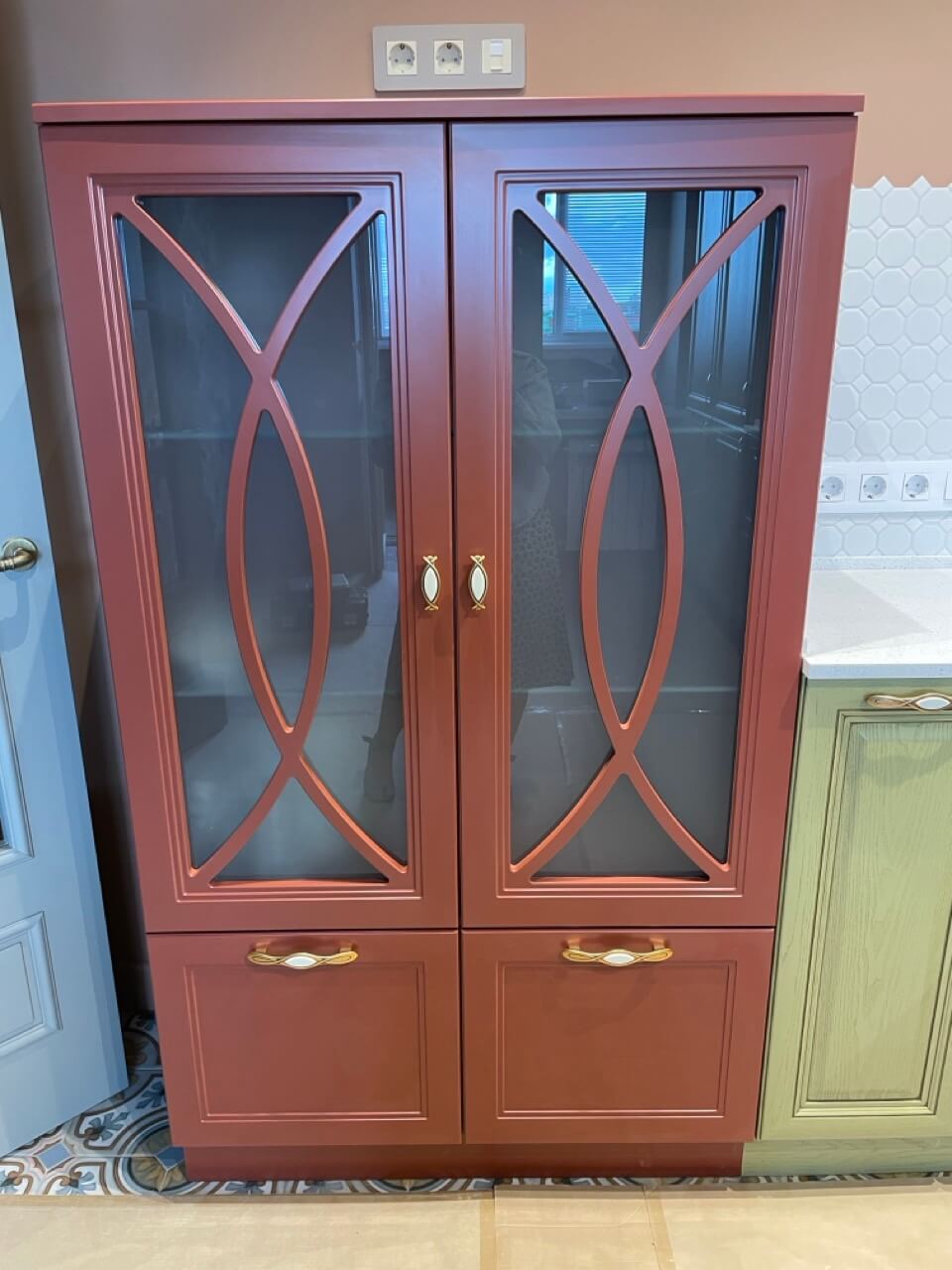 Фасады гарнитура выполнены из массива с добавлением МДФ, покрытых матовой эмалью, которая не только придает изделию изысканный вид, но и обеспечивает надежную защиту от повреждений и загрязнений. Витрина сделана из прозрачного стекла, которое подчеркивает красоту фасадов и создает ощущение легкости и простора.